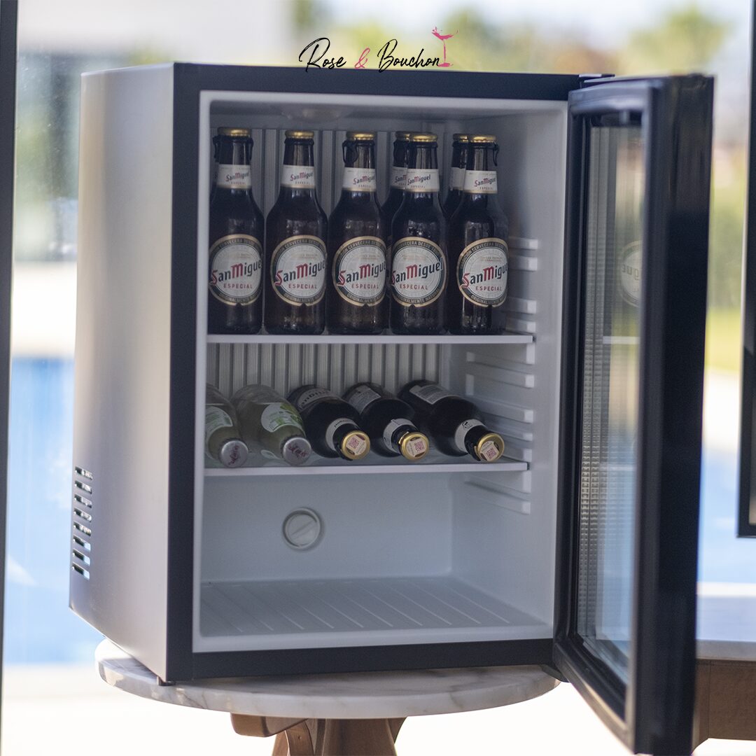 Mini bar silencieux 100% silencieux- ROSE ET BOUCHON Conçu par Rose et Bouchon Garantie : 2 Ans Niveau sonore : 0 Décibels Technologie avancée de refroidissement par absorption silencieuse Pas de vibration et pas de bruit Largeur : 44 cm Profondeur : 44 cm Hauteur : 53.5 cm Volume : 40 Litres Poids : 17 Kgs Idéal à mettre dans votre chambre à coucher ou salon Isolation magnétique tout autour de la porte Étagères/Racks réglables Isolation sans CFC, respectueuse de l’environnement Découvrez le mini-bar silencieux de Rose et Bouchon, le fruit d’une longue expérience dans le domaine. Conçu pour une expérience de détente ultime, ce mini-réfrigérateur compact allie élégance et fonctionnalité. Inspiré par la tranquillité de la nature, il est idéal pour garder vos boissons fraîches sans perturber l’ambiance. Son design raffiné s’intègre parfaitement à tout espace, offrant une touche d’élégance discrète. Pratique et silencieux, il est parfait pour les chambres, les bureaux ou les salons. Avec le mini-bar de Rose et Bouchon, profitez d’un moment de calme et de raffinement où que vous soyez